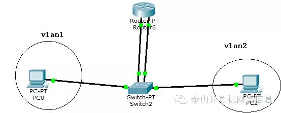 1、通過路由器的多個物理接口實現局域網不同vlan間路由。網絡現有vlan1和vlan2兩個vlan,vlan1配置192.168.1.0網段,vlan2配置192.168.2.0網段,每個網段有一臺電腦,連在交換機上。拓撲圖如下所示: