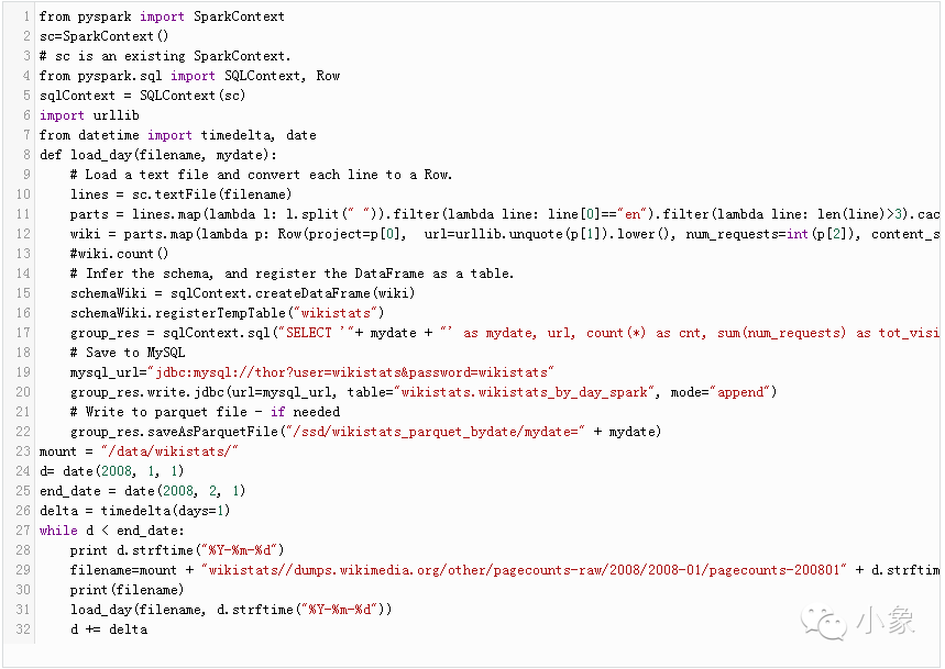 不過最簡單的辦法是使用Apache Spark和Python腳本(pyspark)。Pyspark可以讀出原始的壓縮txt文件,用SQL進行查詢,使用篩選、類似urldecode函數等,按日期分組,然后將結果集保存到MySQL中。